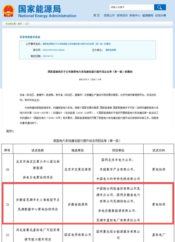 近日,国家能源局官网正式公布首批新型电力系统建设能力提升试点名单,市交通能源集团下属市虚拟电厂公司参与的“安徽省芜湖市长三角枢纽节点芜湖数据中心算电协同项目”成功入选,试点方向为“算电协同”。